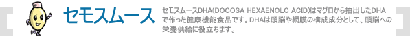 乳児成長に重要な母乳の中のDHA含量は牛乳に比べずっと高いのです。また、現代人のバランスの崩れた食生活に役立つ健康機能食品です。DHAは体内で十分に作られない成分でありながらも、日常の食生活では必要量を摂取しづらいので、含有食品を摂取する努力が必要です。従ってセモではマグロから抽出したDHAで作った健康機能食品セモスムースDHAを作り、供給することになりました。便利な携帯用カプセル包装のセモスムースDHAはDHA含有製品として健康生活を営もうとする方々の良き伴侶になることでしょう。海外へも輸出されているセモスムースDHAは、セモスクアレンを作ってきたセモが厳格な品質管理で製造した健康機能食品です
